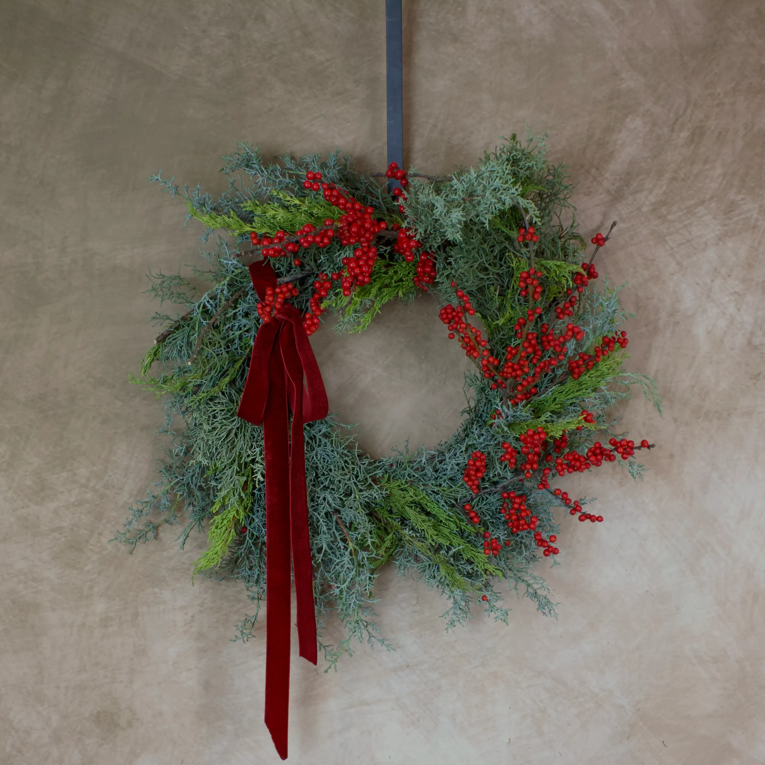 A vibrant mix of winter cedar and bright crimson berries creates a lush, textured wreath with a naturally elegant silhouette. Finished with a long, deep-red ribbon for a touch of luxury, Crimson Grove Wreath brings modern seasonal warmth to any doorway or wall. Fresh, festive, an elegant , contemporary take on a holiday classic.