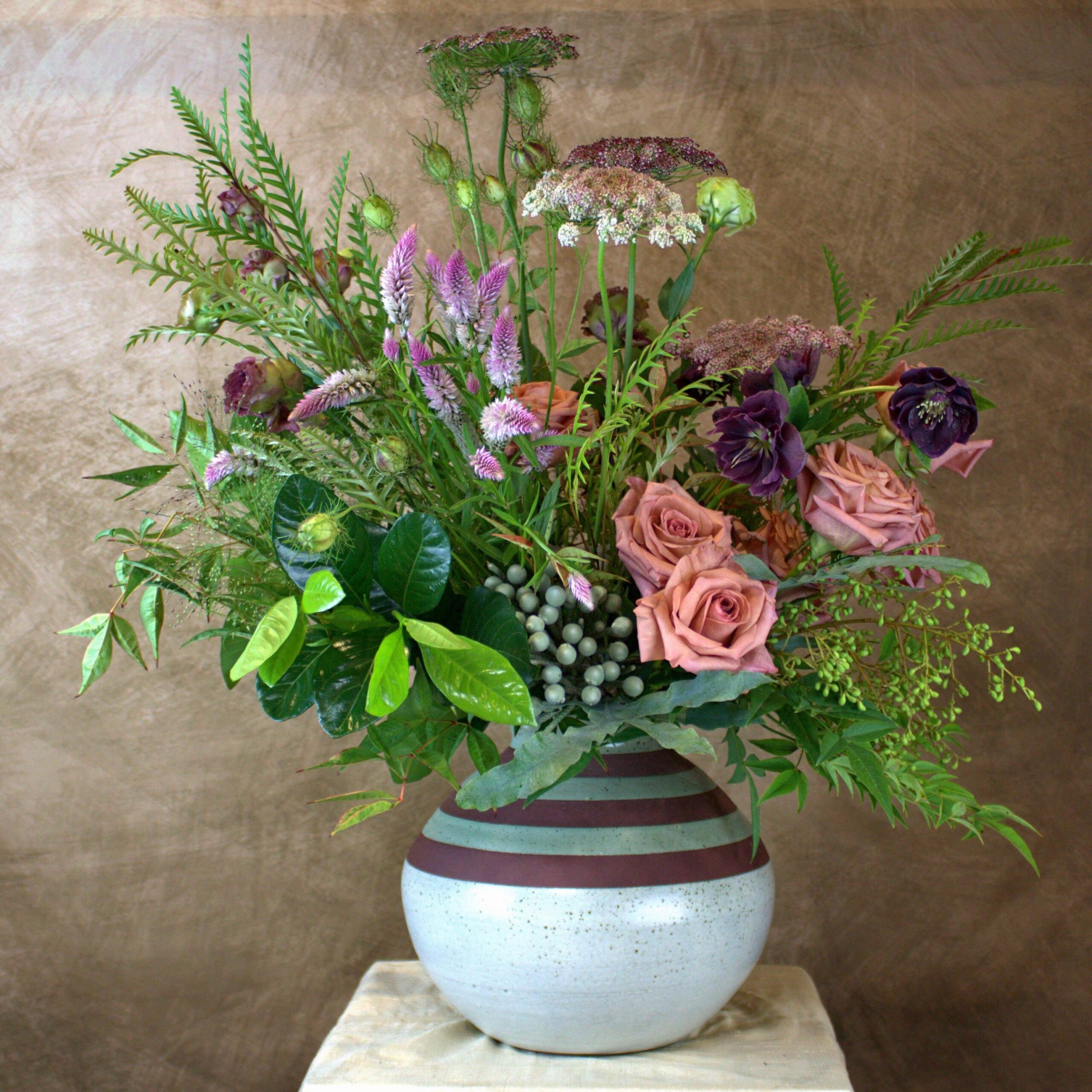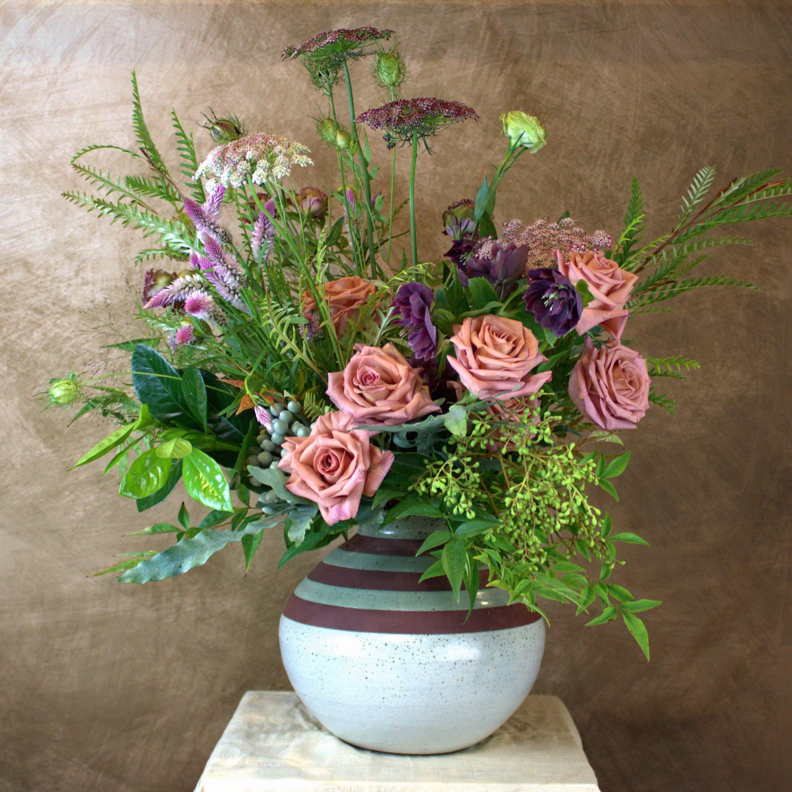 An architectural vessel with bold striped detailing and a subtle earthy band sets the stage for this autumnal design. Lush dusky roses, sculptural foliage, and textured seasonal blooms create a layered composition that feels both timeless and modern. Etruscan Equinox is equally striking as a dramatic centerpiece or an elegant accent, embodying the rich warmth of the season.