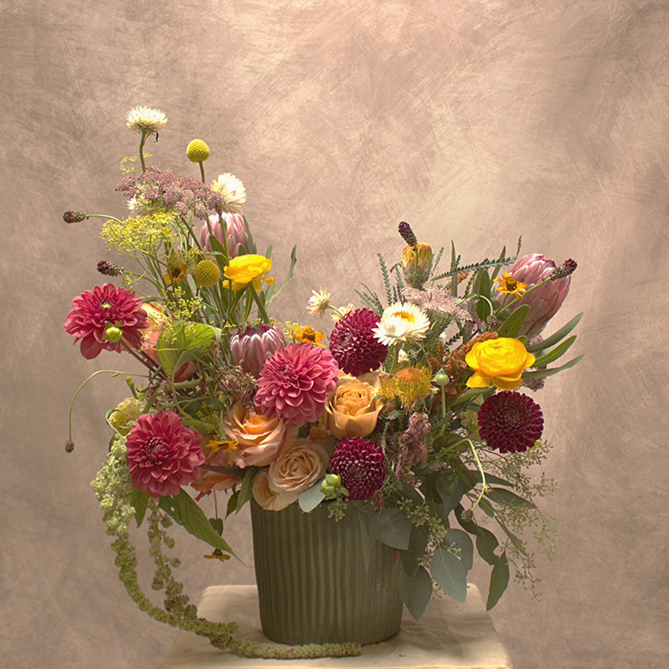 A jubilant celebration of autumn’s abundance, this lush arrangement overflows with richly hued dahlias, golden ranunculus, sunset-toned garden roses, and sculptural protea. Wisps of amaranthus and airy textures dance between bold jewel tones and glowing saffron, evoking the warmth of a festive harvest table. Designed in a tevtured, matte green vessel, it captures the spirited elegance of fall gatherings—vibrant and alive with the season’s bounty.