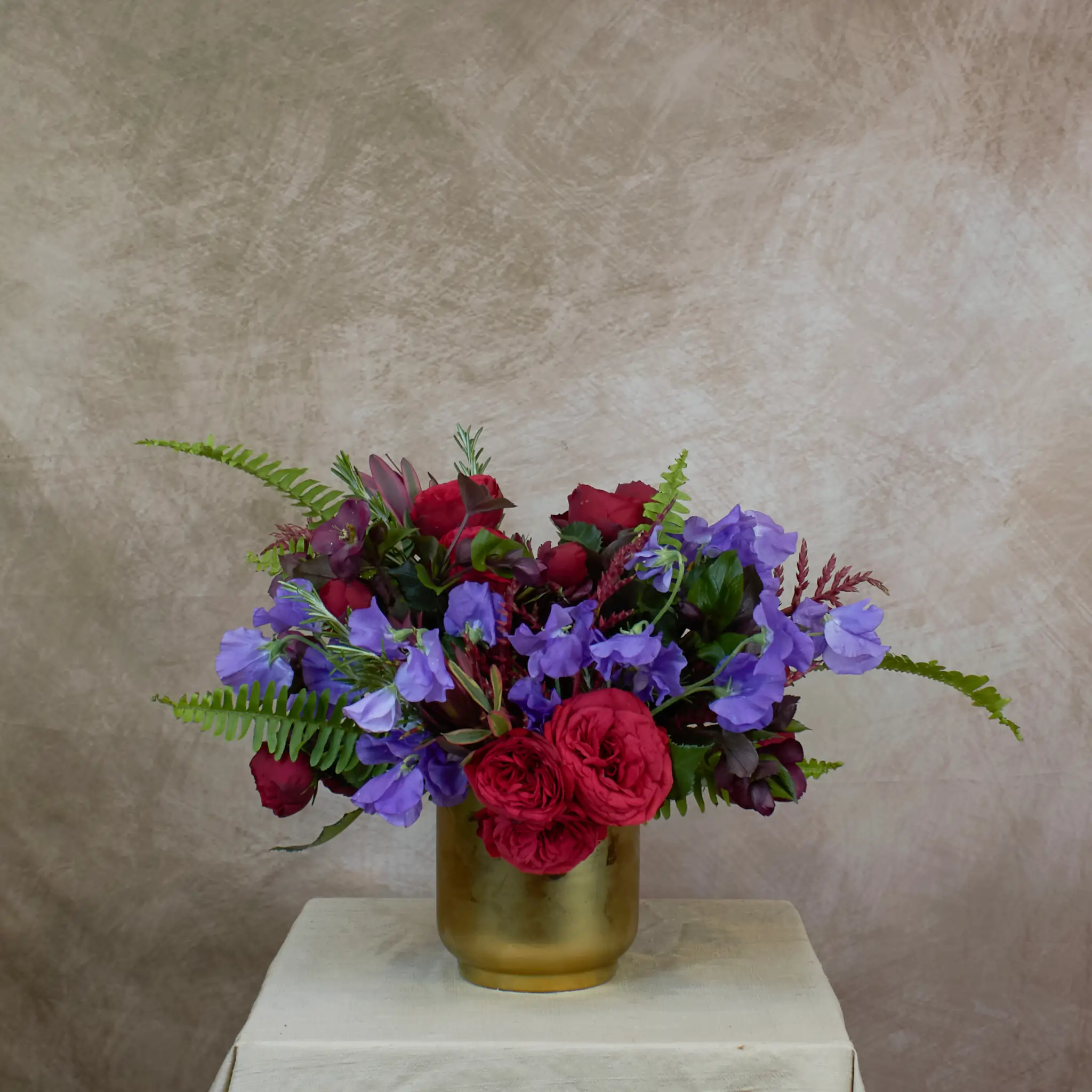 A dramatic winter composition of deep red garden roses and velvety violet blooms, accented with fern fronds and rich seasonal foliage. The saturated palette creates a moody, nocturnal glow, while the airy movement of sweet peas adds a soft, luminous contrast. Bold, refined, and full of jewel-tone depth, Jeweled Nocturne brings a sophisticated, after-dark elegance to our Winter in the Garden of Eden collection.
