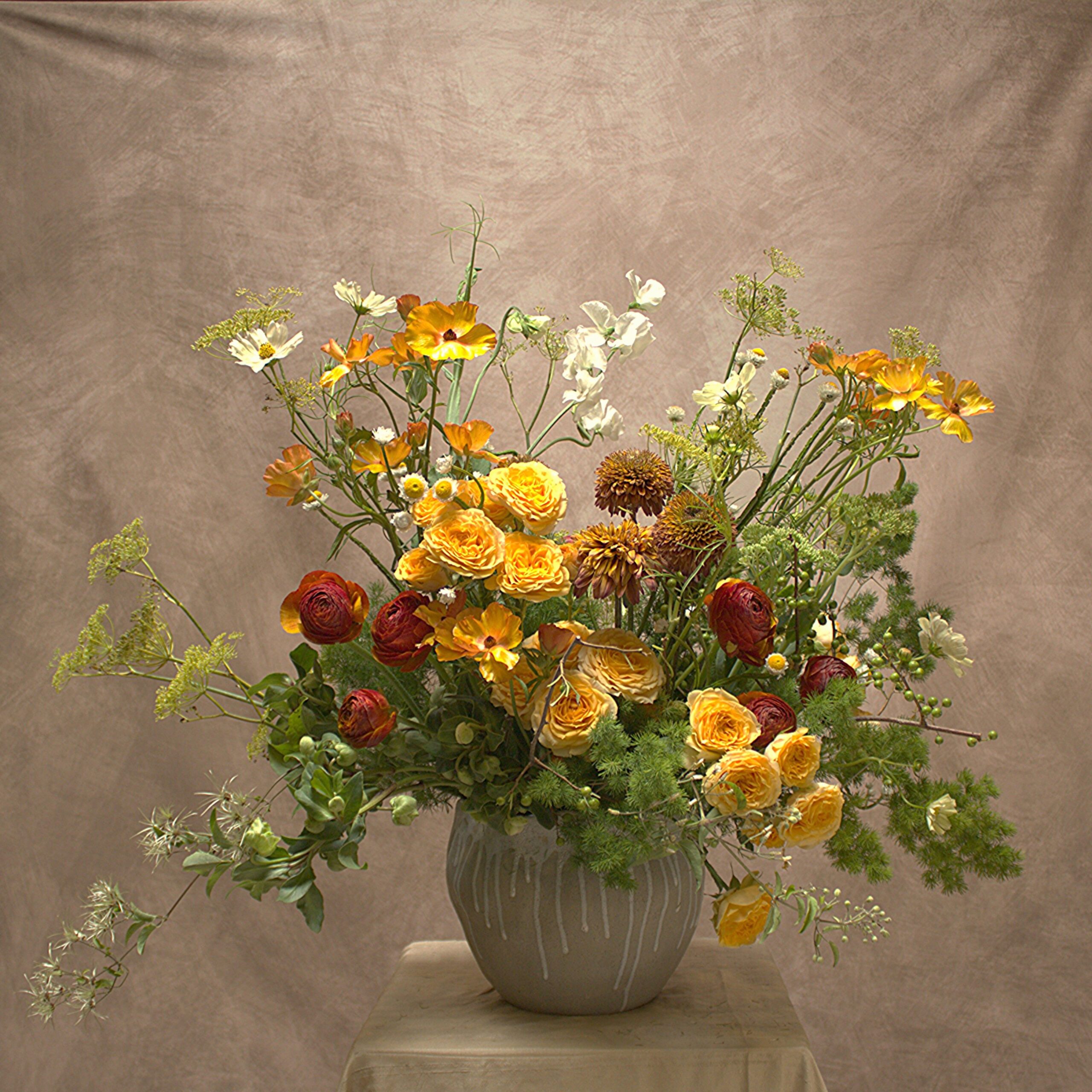 Golden cosmos and vibrant yellow ranunculus mingle with rich pomegranate-red blooms and airy wildflowers, creating a composition alive with movement and texture. Arranged in a soft grey vessel, this design captures the warmth and abundance of autumn fields—a harmonious blend of rustic charm and refined elegance, inspired by the flowing lines and romantic botanical style of Alphonse Mucha.