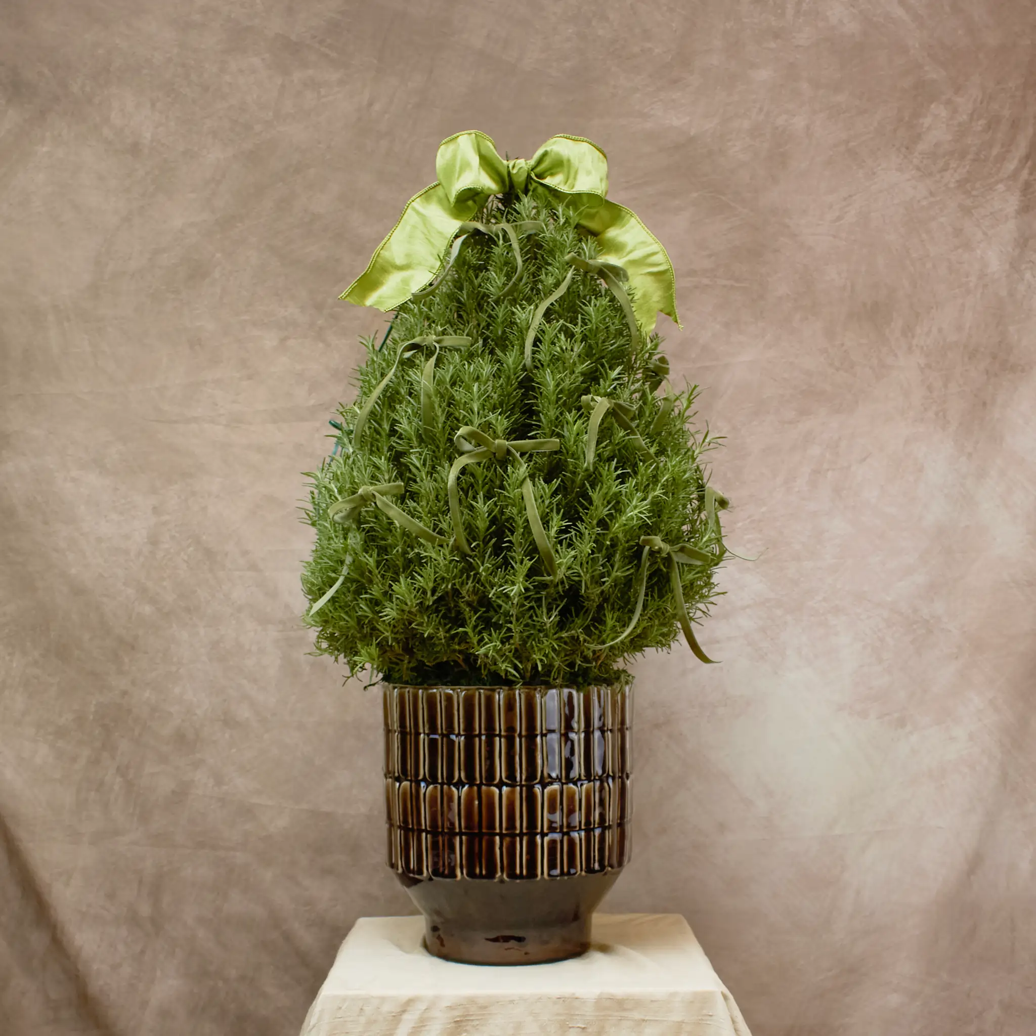 A sculpted rosemary topiary dressed in soft green ribbon, presented as a living seasonal accent. This potted plant is ideal for indoor display or a covered patio, bringing fresh herbal fragrance and elegant texture to any space. Set in a deep espresso-brown ceramic vessel with a modern, ridged silhouette, Rosemary Luxe pairs natural simplicity with refined, understated luxury.