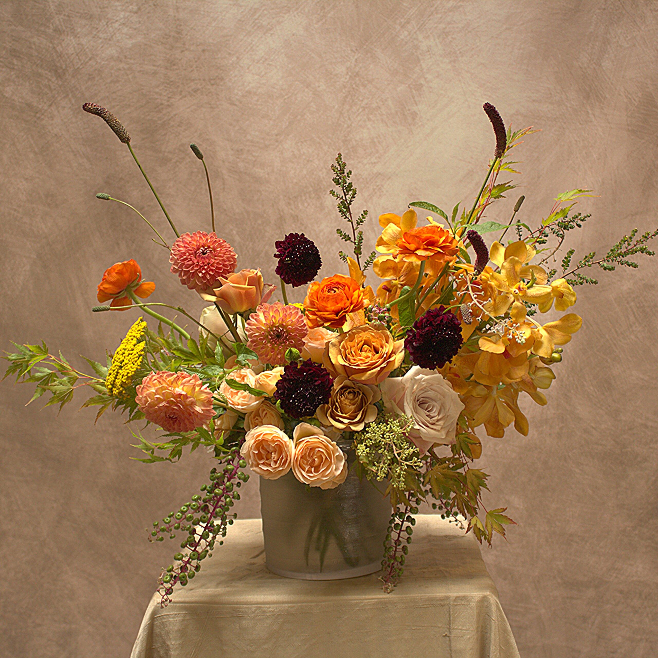 Golden orchids, coral dahlias, apricot and blush roses, and deep wine accents unfold in a dynamic, painterly arrangement. Sculptural greenery and airy movement give it a modern elegance, while the warm, luminous palette evokes the richness of autumn light- makingĀ it a statement piece for any refined setting.