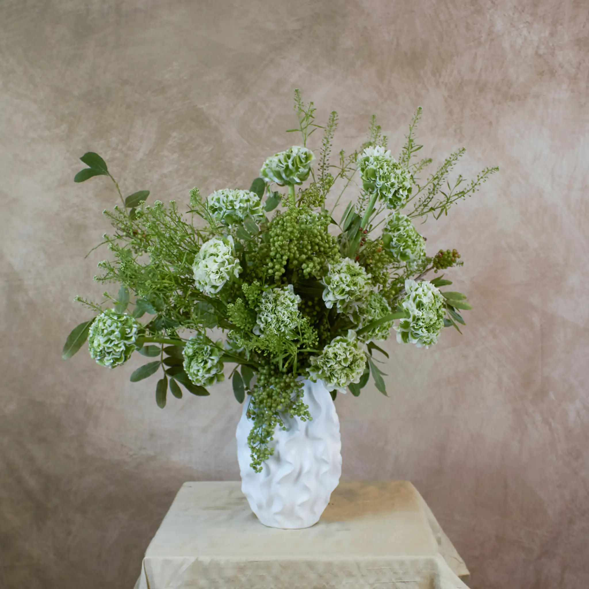Ruffled specialty ranunculus and clustered winter blooms gather with airy seasonal foliage in a sculptural textured vessel that echoes the soft curves of the petals. The composition feels light and intricate, with gentle movement and a cool, luminous palette. Snowlace brings a refined, modern elegance to the collection, balancing texture, simplicity, and simple, yet stunning winter beauty.