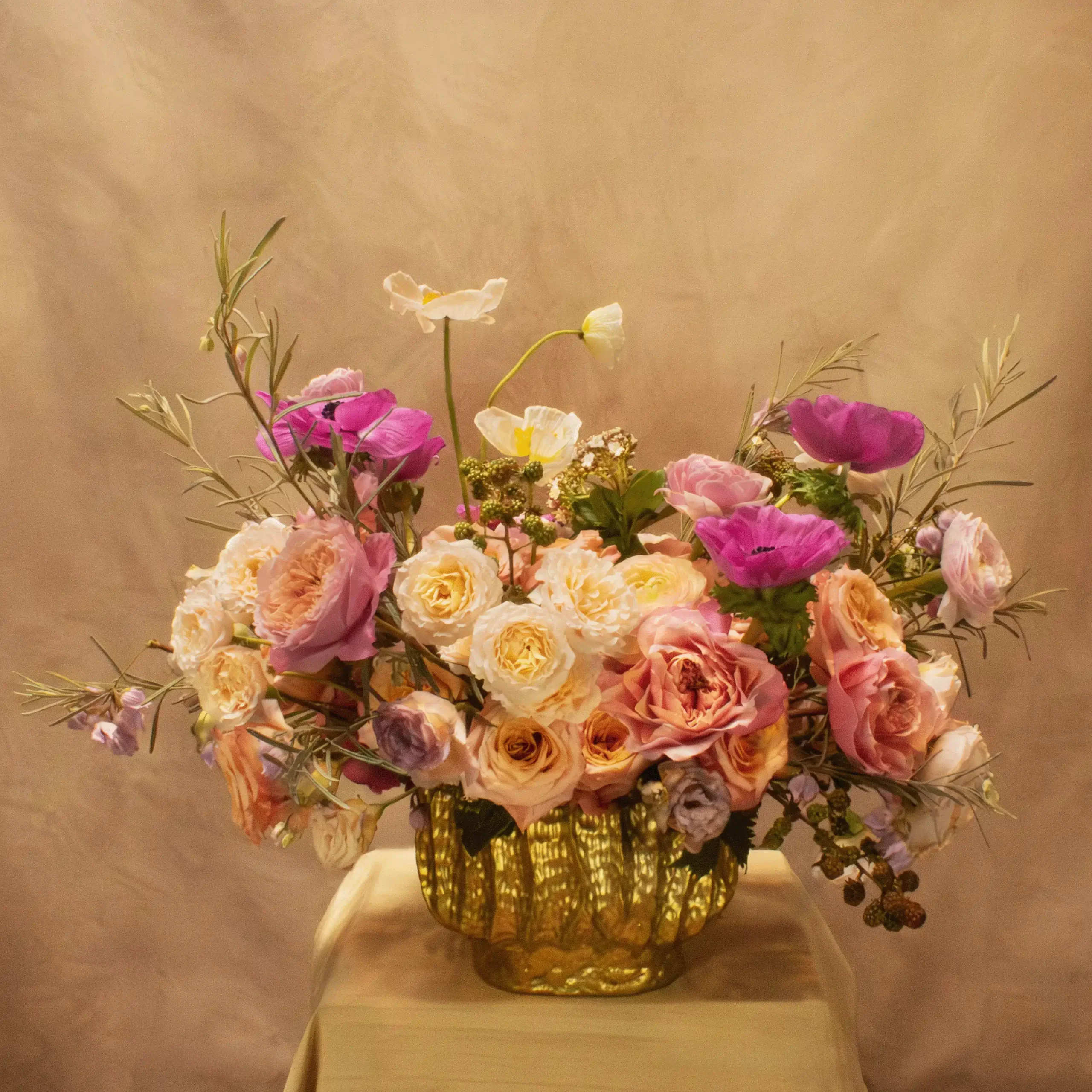 Sonnet of Light is a luminous expression of enduring love, composed in soft blush, warm apricot, and creamy garden roses, gently lifted by airy stems and delicate movement. Romantic without excess, the arrangement glows with quiet richness and depth, offering beauty that feels intimate and yet- declared. Inspired by the language of devotion that deepens over time, it reflects a love that is steady, generous, and lasting – loved thee to the depth and breadth and height my soul can reach – and is meant to be lived in, cherished, and returned to, by sun and candlelight.