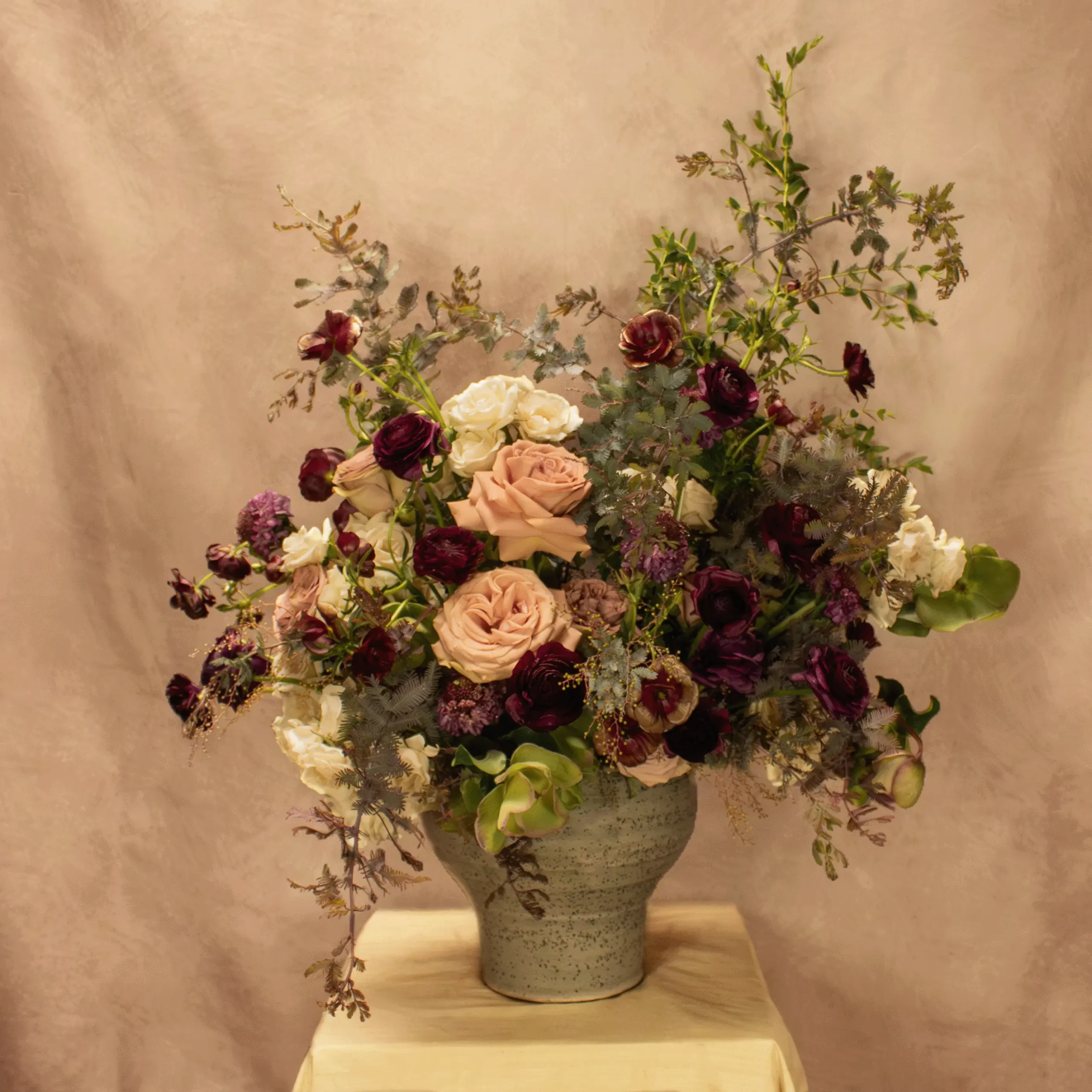 A composition inspired by devotion earned through partnership, The Prize brings together soft blush and ivory blooms with deeper wine and plum tones, gathered in thoughtful balance. Silvery foliage and layered textures create depth and intention, while the overall form feels generous and composed. Romantic yet refined, this arrangement reflects a love built on respect, shared pursuit, and lasting commitment, something cherished not for display, but for its meaning and rarity.