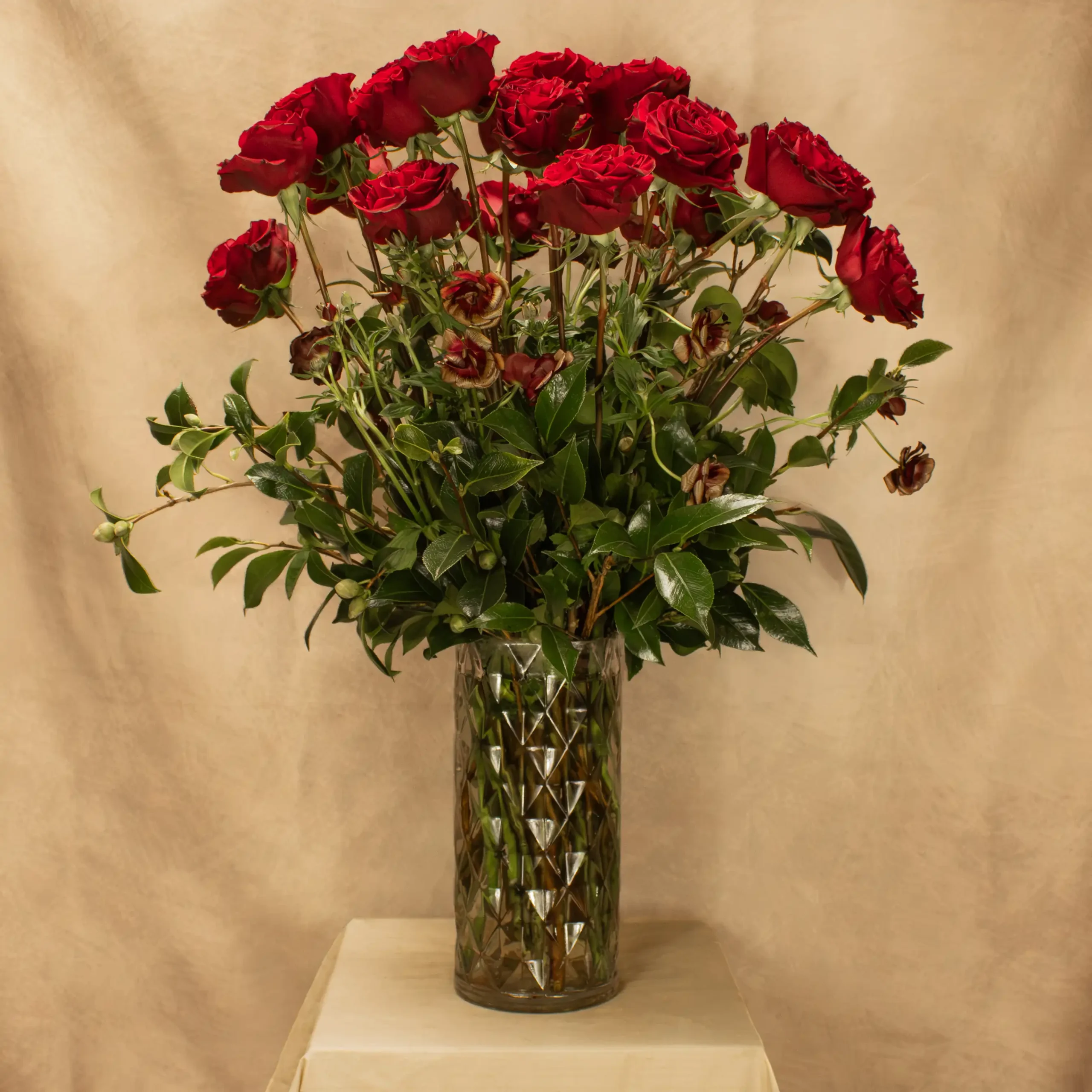 A classic expression of romance, True Love is defined by clarity, confidence, and sincerity. Rich red roses rise with intention above a bed of polished greens, creating a composition that feels both abundant and assured. The structure is clean and upright, allowing each bloom to stand proudly, timeless, unmistakable, and deeply romantic. This arrangement speaks to love that is declared openly and felt without question, elegant in its simplicity and enduring in its meaning.