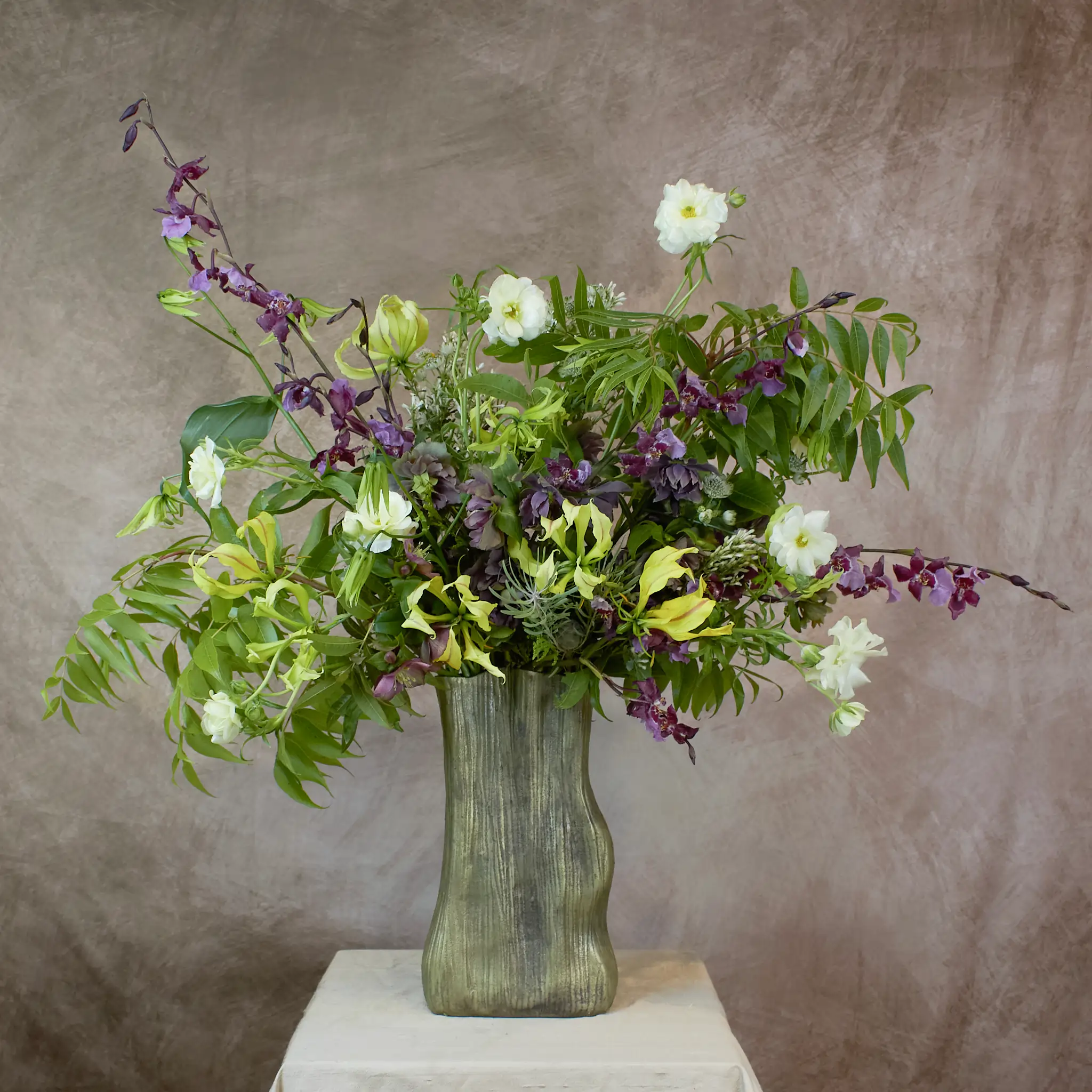 A sculptural gathering of chartreuse blooms, deep violet accents, and wild garden greenery rising in an organic, textured vessel. Airy clematis, hellebore, and cascading foliage create a sense of movement, as if gathered from a hidden forest clearing. Wild Woodland is untamed, elegant, and atmospheric,  A modern nod to our winter’s wilder side.