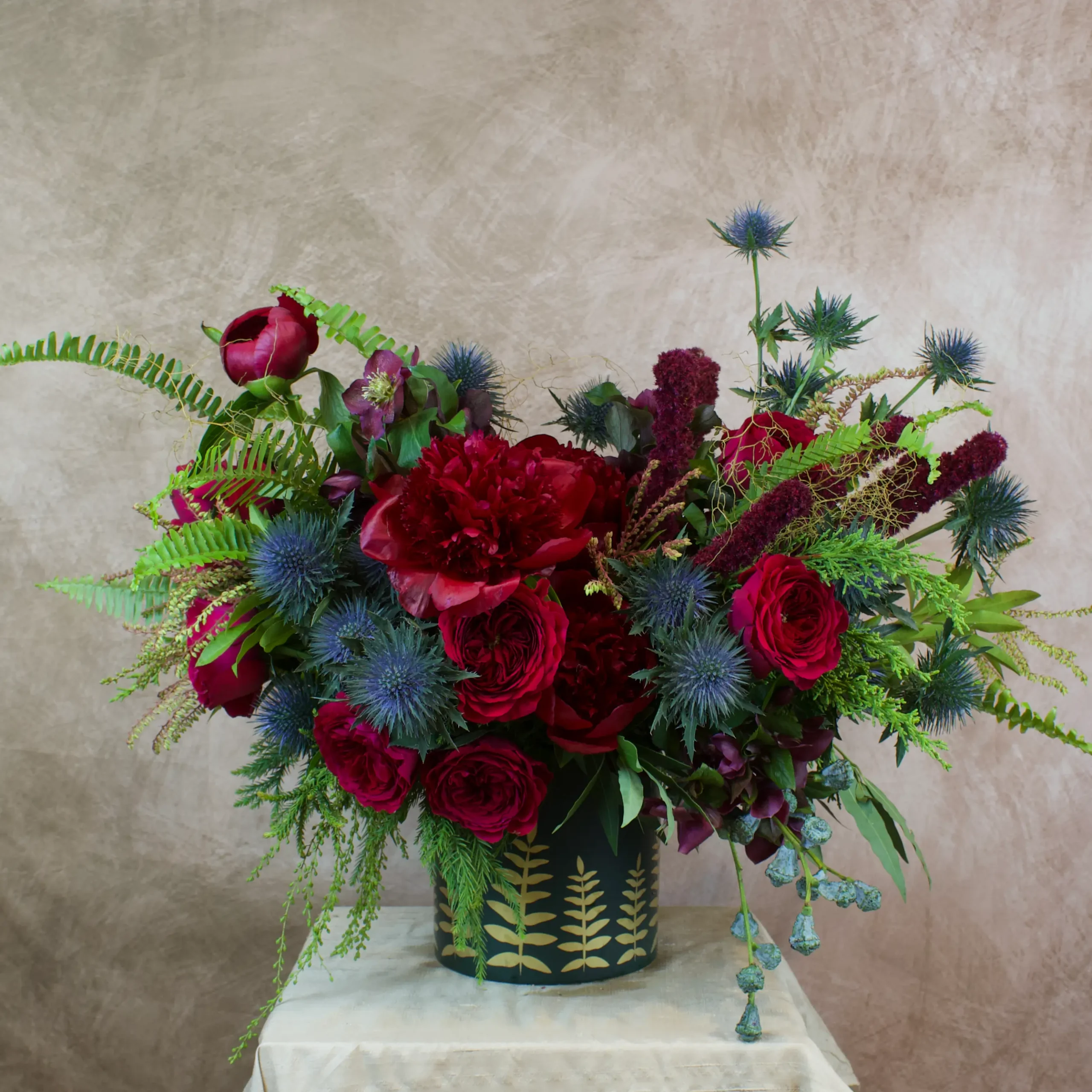 A celebratory sweep of deep winter color and texture. Jewel-toned peonies and specialty garden roses mingle with blue thistle, amaranthus, ferns, and winter greenery, creating a lush woodland moment with a festive, dramatic edge. Arranged in a matte black vessel etched with golden botanicals, it feels both enchanted and elegantly seasonal, a true statement of holiday revelry.